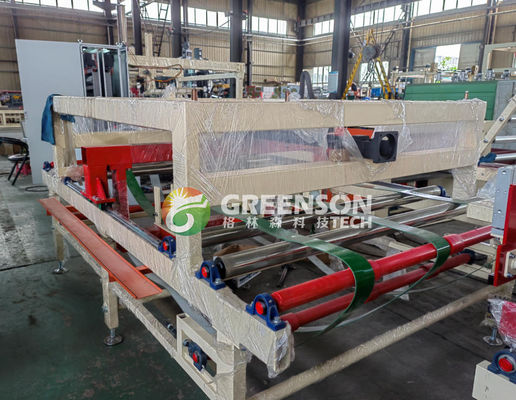Deze volautomatische lamineermachine verbindt decoratieve film met gipsplaten of plafondtegels met precisie en efficiëntie. Het proces begint met het plaatsen van platen op rollen, gevolgd door stofafzuiging en lijmtoepassing. De lijm wordt gecontroleerd op kwaliteit op geleiderollen voordat deze wordt gecombineerd met film in het recombinatiemechanisme. Het materiaal gaat vervolgens door persrollen, knijprollen en vormrollen om het laminatieproces te voltooien.